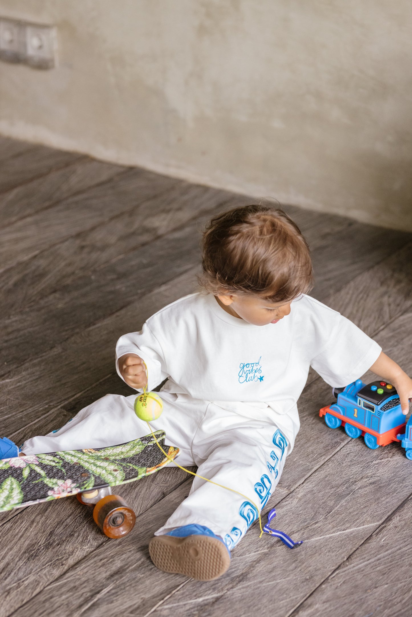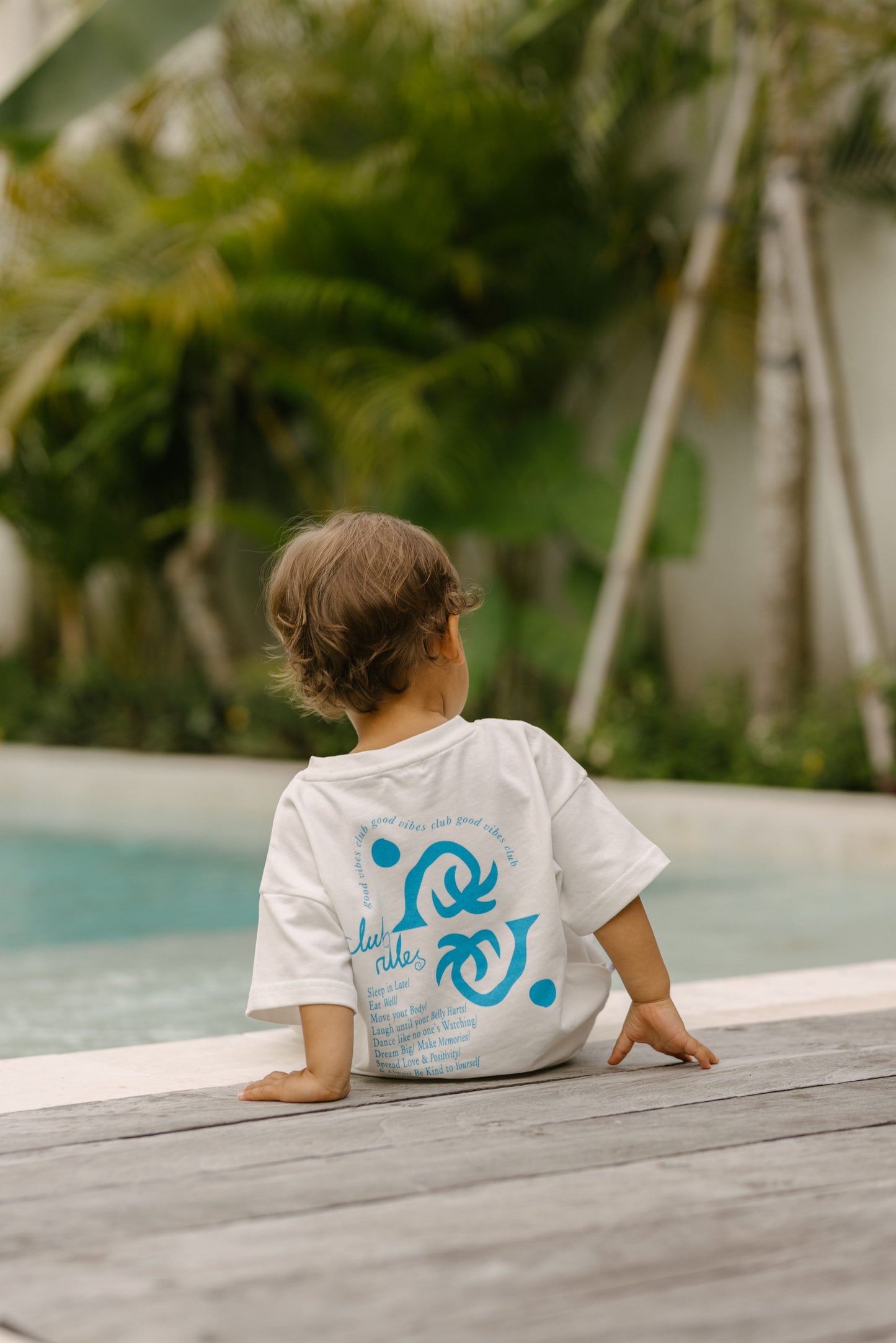Our good vibes club tee is designed with a relaxed boxy fit—we recommend selecting the size closest to your child's age for the perfect fit. Kai wears a size 2.
