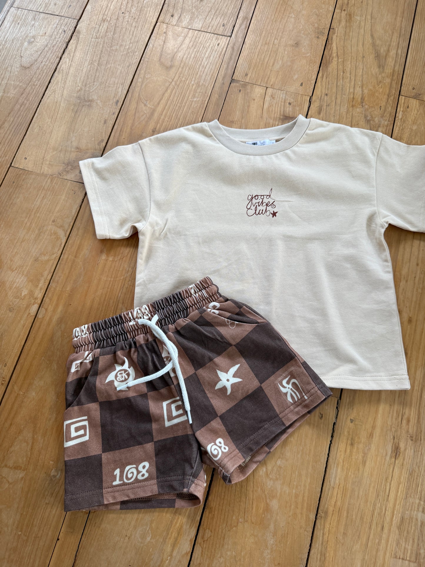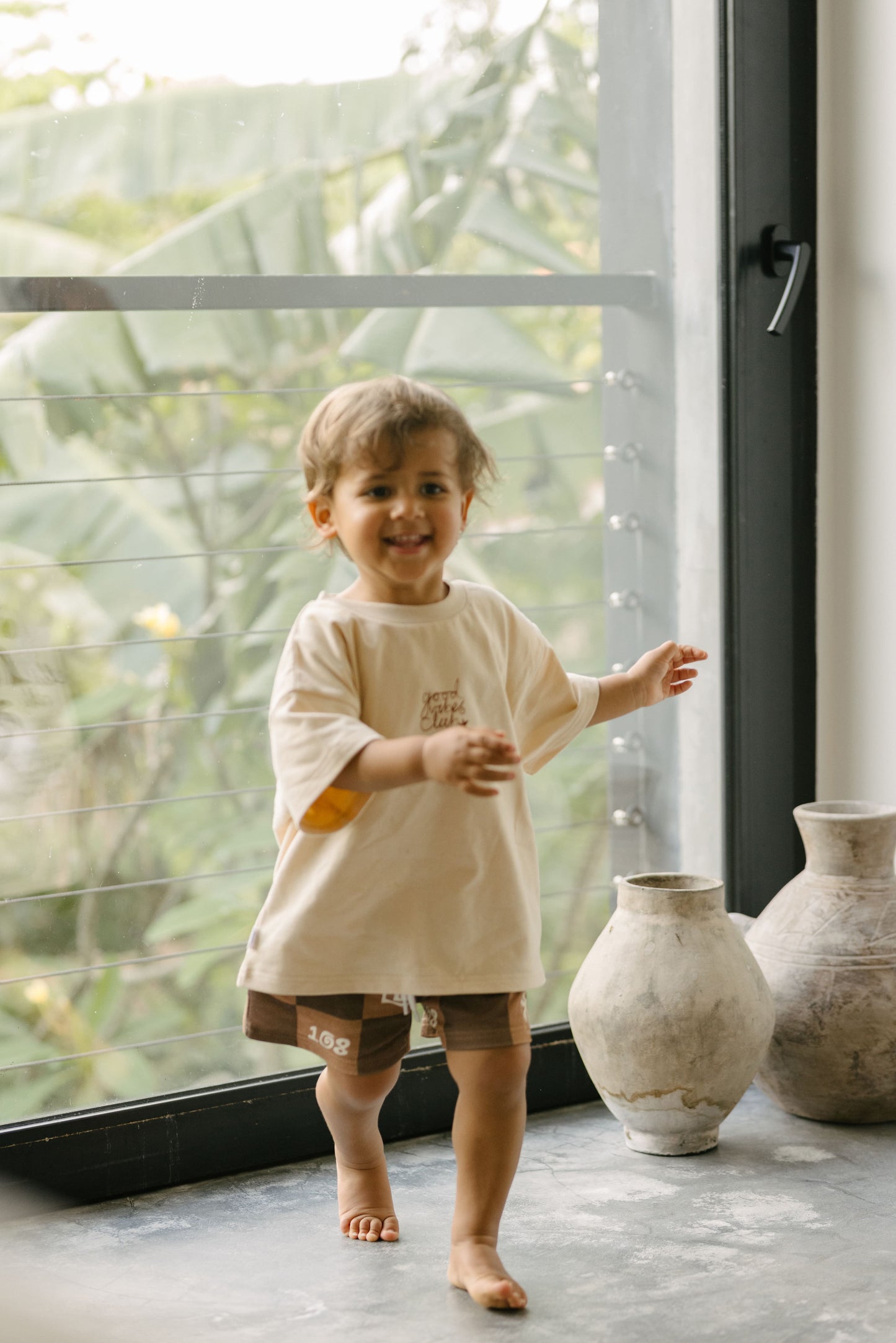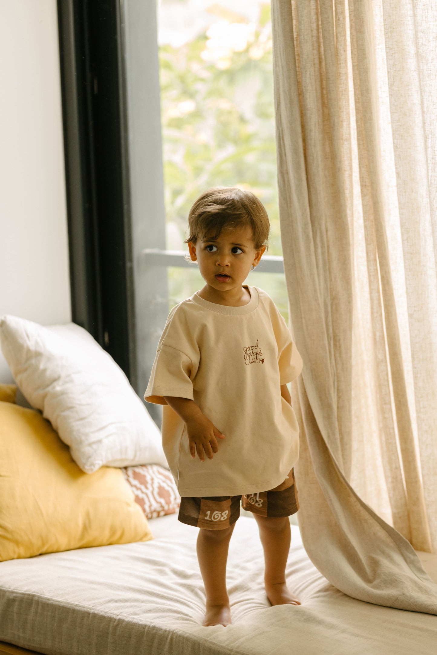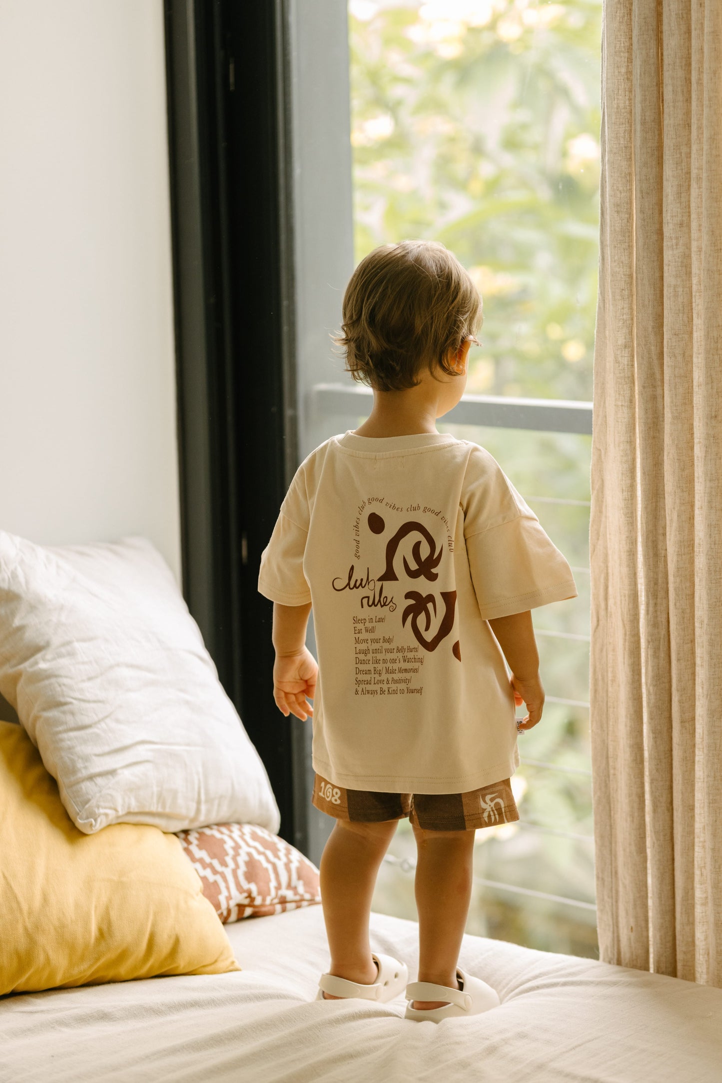 Our good vibes club tee is designed with a relaxed boxy fit—we recommend selecting the size closest to your child's age for the perfect fit. Kai wears a size 2.
