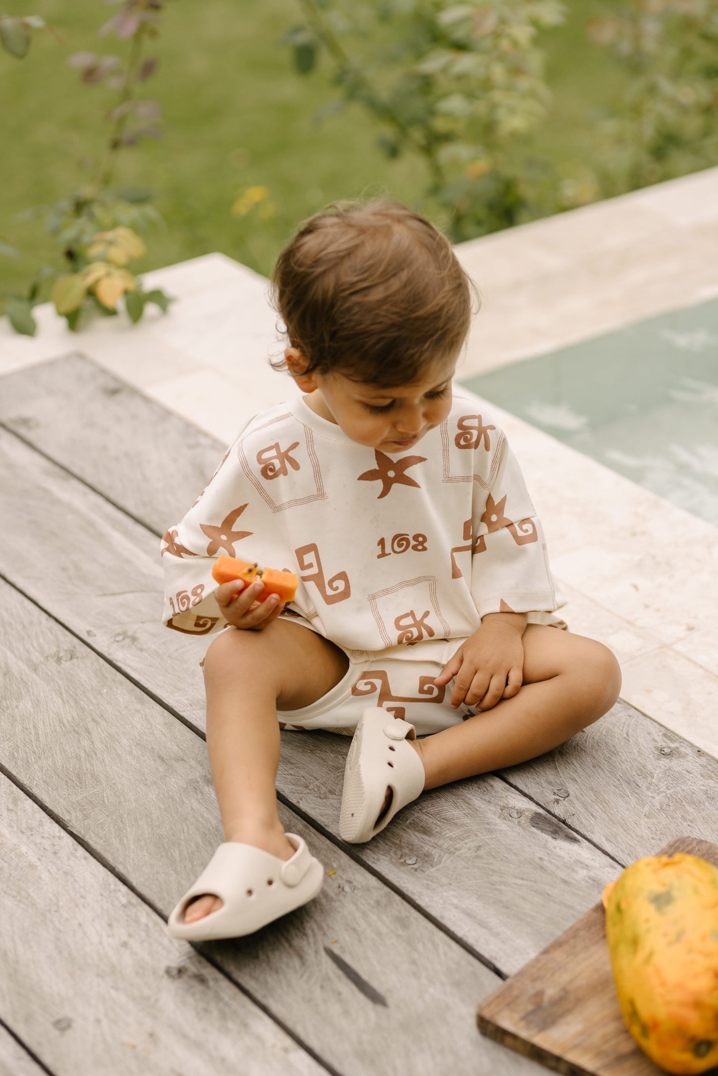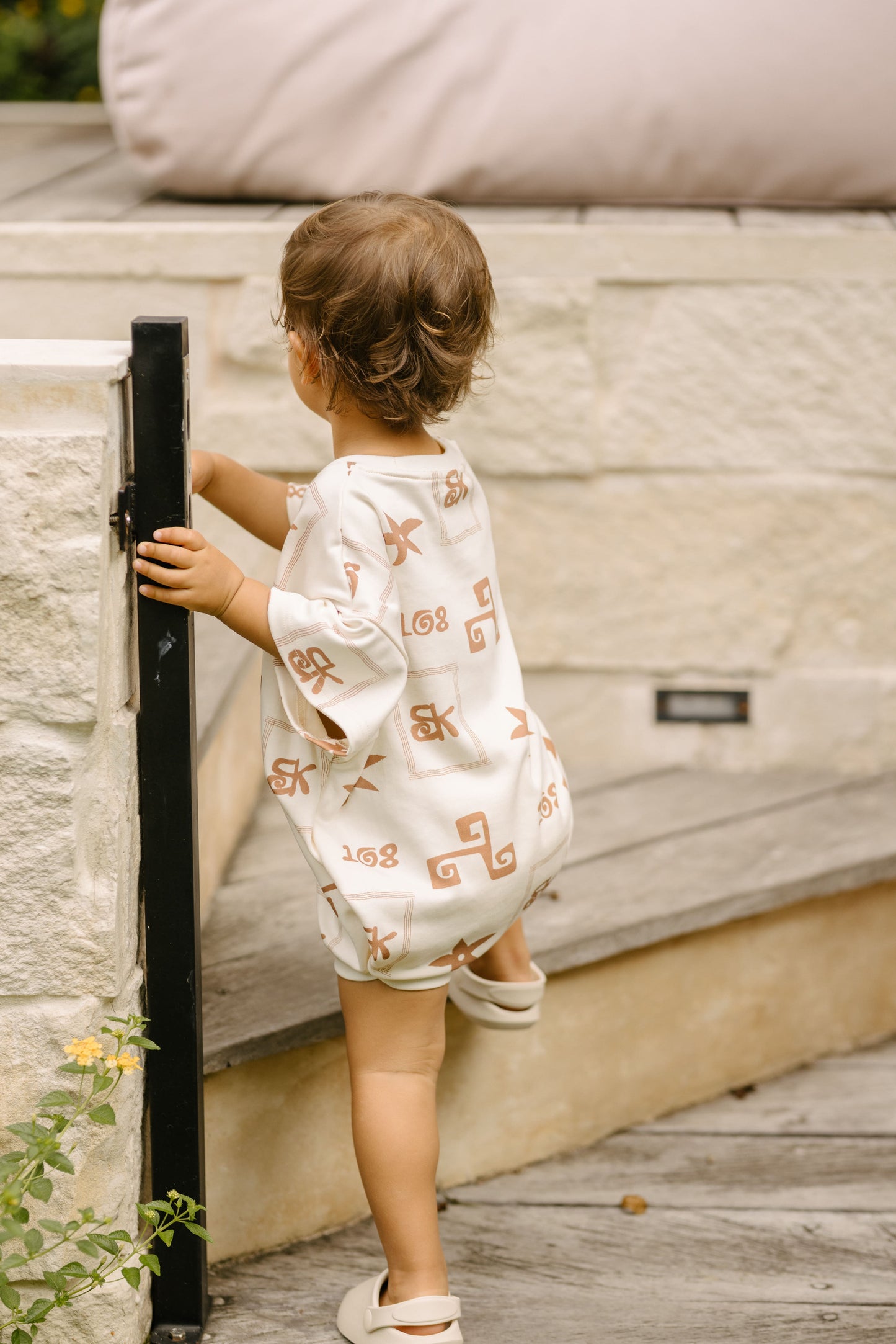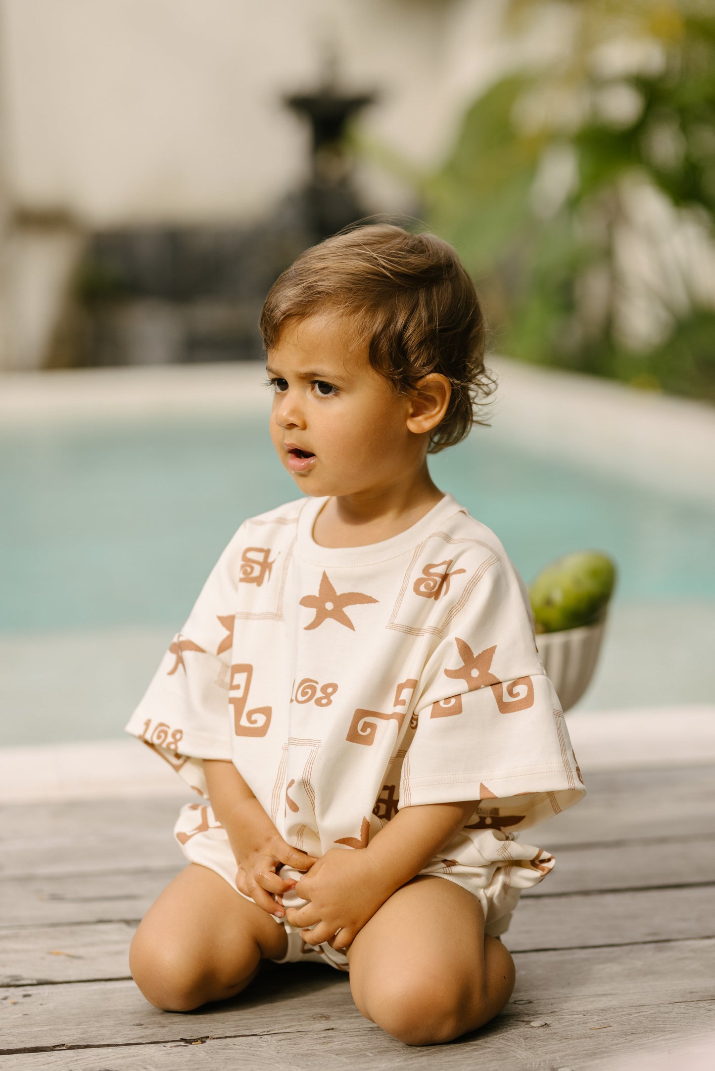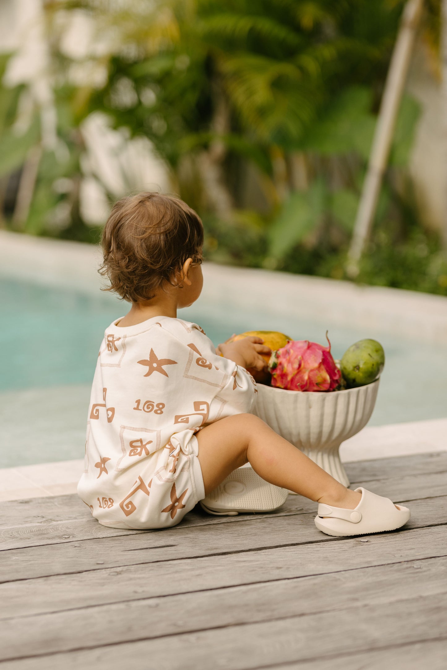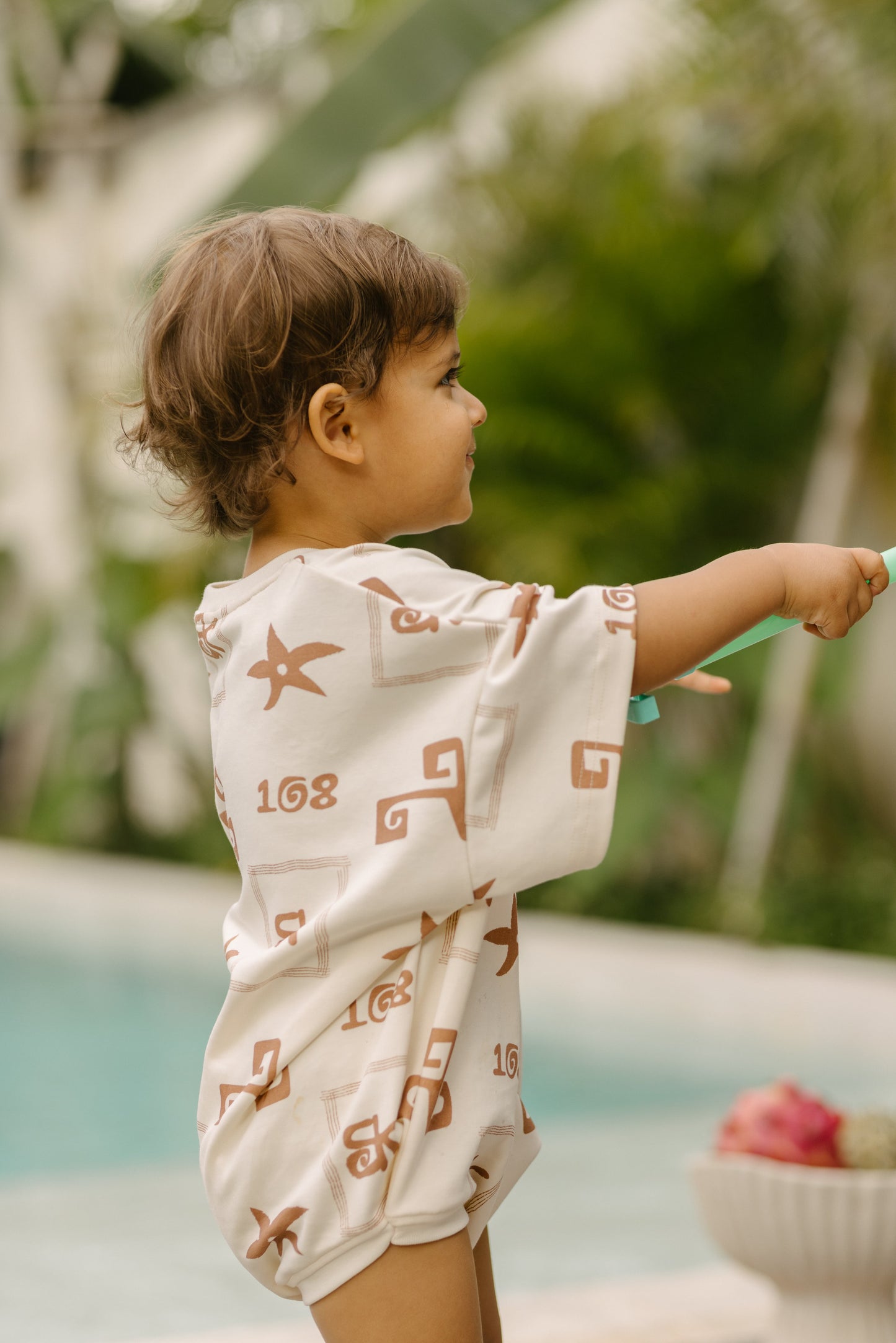 Meet the Tiny Tides Romper—made from super-soft cotton with a custom print by Yore Studio. It’s oversized fit gives extra wiggle room and longer wear, plus snap buttons down below for quick, easy nappy changes. Ready for sunny days, beach fun, and all those chilled-out vibes.